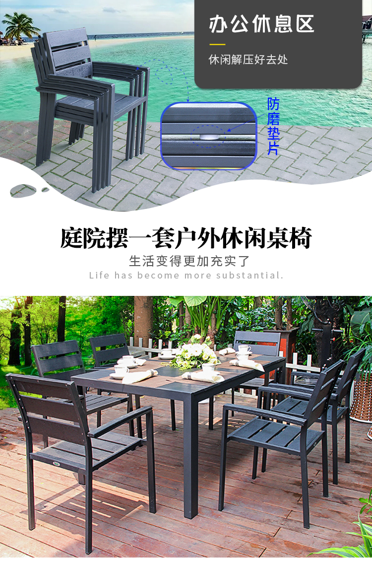短亮點:1.環(huán)保PS木,防水抗曬 2.鋁合金框架,不會生銹 3.人體工學,倚靠舒適
