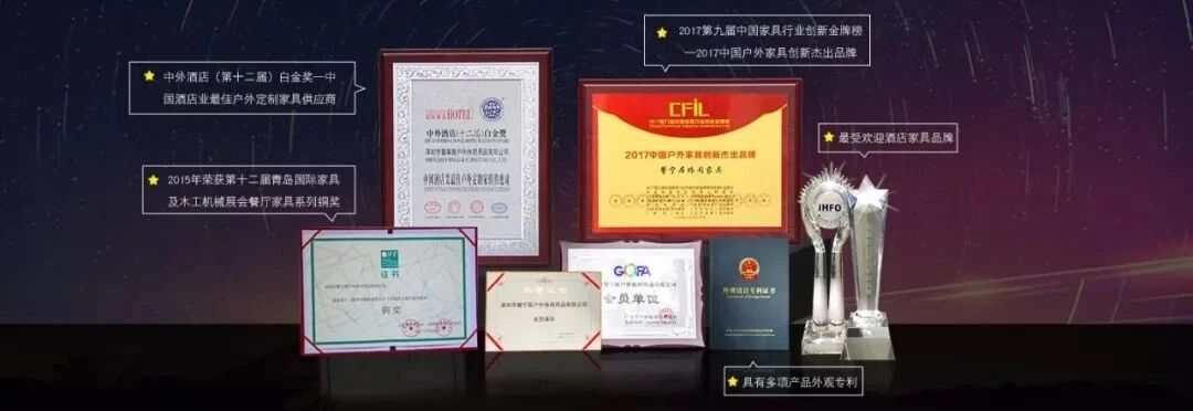 “馨寧居”公司先后在2017廣東國(guó)際旅游產(chǎn)業(yè)博覽會(huì)暨第十五屆廣州國(guó)際酒店用品展覽會(huì)獲得“最受歡迎酒店家具品牌獎(jiǎng)”,還有全國(guó)環(huán)保會(huì)展、奧運(yùn)成果展覽等,均留下了我們的足跡。2017年,深圳市馨寧居戶外休閑用品有限公司,在中外酒店業(yè)屆公認(rèn)最具公信力的獎(jiǎng)項(xiàng)之一——“中外酒店白金獎(jiǎng)”評(píng)選中,從眾多候選家具品牌中脫穎而出,奪得中外酒店(十二屆)最佳戶外定制家具供應(yīng)商【白金獎(jiǎng)】!